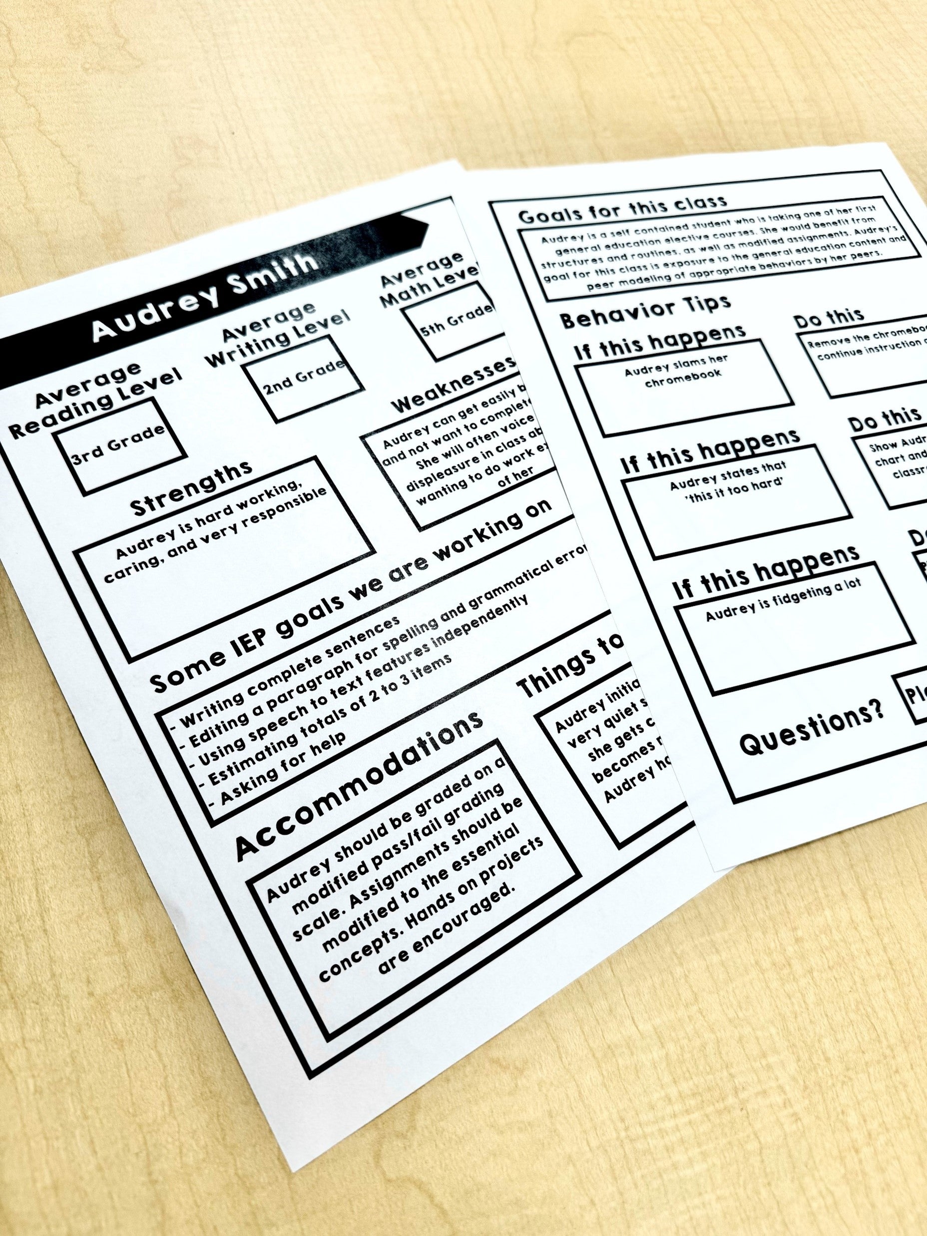 Teacher Cheat Sheet - Student at a Glance IEP Cheat Sheet